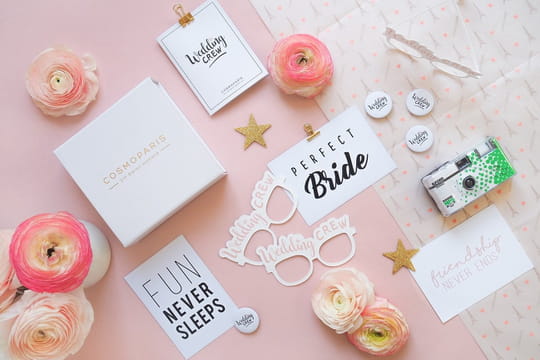 Votre meilleure amie se marie bientôt et son EVJF approche à grand pas ? Shooting photo, massage, clip vidéo… Si vous n'avez pas encore fini de tout organiser, voici une nouvelle qui ne devrait pas vous déplaire. Cosmoparis, qui avait sorti l'an dernier une box pour les témoins, lance en effet cette année encore, une box spécialement pensée pour les copines de la future mariée. Si elle convient parfaitement pour un EVJF, la box Wedding Crew peut être aussi offerte lors d'une séance photo, voire le jour J. Elle contient tout le nécessaire pour détendre l'atmosphère. Il y a ainsi douze cartes postales aux messages déjantés, six paires de lunettes décalées, six badges customisés, six ballons personnalisés et un petit carnet Cosmoparis. Et pour immortaliser ces bons moments, il y a également un appareil photo jetable old school, qui permet de faire 27 clichés en noir et blanc. La future mariée et ses amies pourront par ailleurs bénéficier de 20% sur la collection.