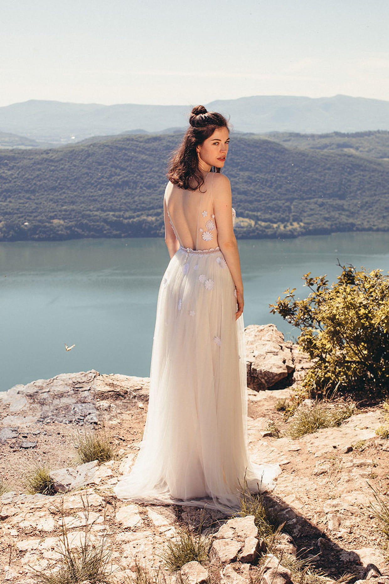 Craquez pour le dos nu de cette robe en tulle et en crêpe de soie. Le jupon légèrement bouffant est brodé de fleurs en coton.
