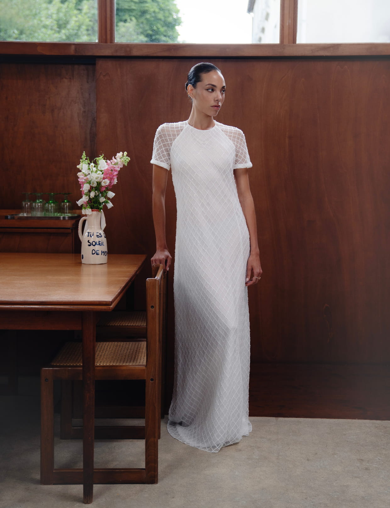 Robe signature d'Azéline, ce modèle possède une coupe droite, une encolure fermée, des manches courtes et dévoile un magnifique dos nu.