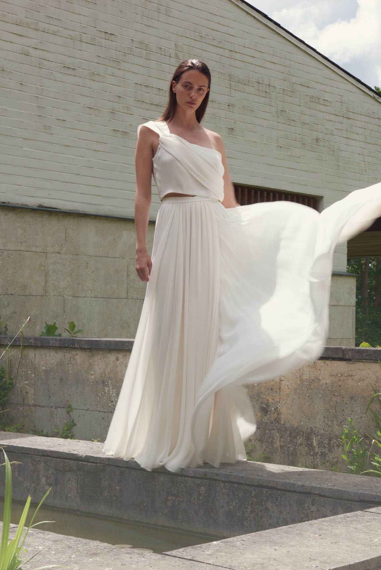 Cet ensemble est composé d'un haut asymétrique drapé en gazar de soie et d'une jupe coupe portefeuille en crêpe georgette de soie.