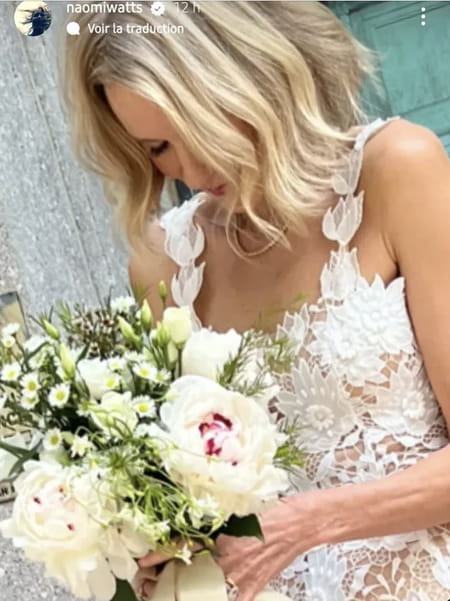 Pour sa mise en beauté, Naomi Watts a misé sur la simplicité. Mise en beauté par un maquilleur et une coiffeuse qui font partie de ses amis comme elle l'a expliqué dans une story Instagram, la comédienne avait les cheveux détachés, une coiffure à la fois naturelle et chic. Quant à son bouquet de mariée, composé de fleurs blanches, il a été acheté "dans une épicerie de quartier".