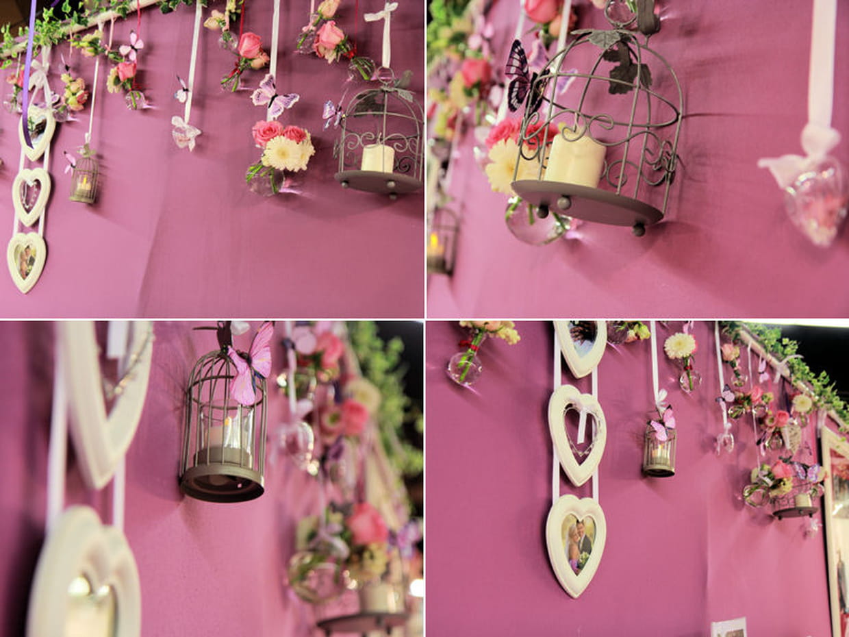 Vous rêvez d'un mariage romantique et champêtre ? Cette décoration proposée par "Les Papillons de Paris" pourrait bien vous séduire ! Soliflores, cadres en forme de cœur, lierre... voilà une décoration murale douce et poétique.