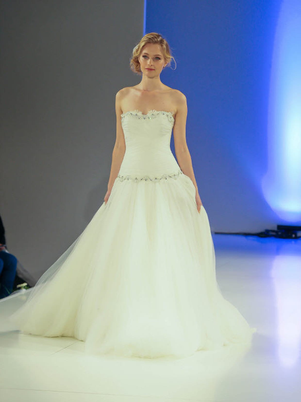 Buste drapé et rehaussé de strass, jupon qui souligne le pas de la mariée. Une robe irrésistible !