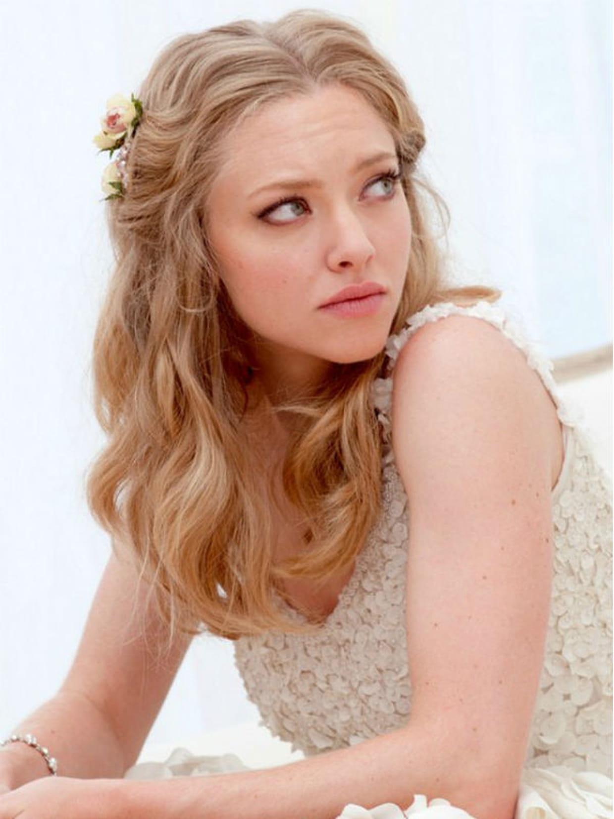 Amanda Seyfied subit de nombreux quiproquo pour son grand jour dans Un grand Mariage. On aime : les fleurs fraîches dans les cheveux et celles cousues sur le buste de sa robe.