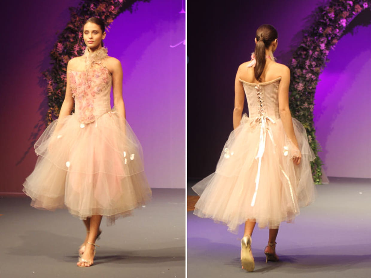Une robe aussi fraîche que la rosée du matin ! Sa couleur poudrée et ses pétales brodés sur le corset et la jupe en tulle lui apportent une touche 100 % bucolique ! Site web : www.florencecastelgaillard.com