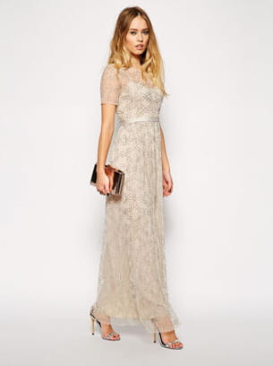 Cette robe à l'esprit vintage est entièrement brodée de perles et sequins. Son coloris argenté reste assez discret.