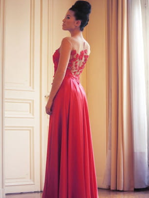 Cette robe longue très élégante en dentelle présente de jolis détails fleuris et un jeu de transparence sexy dans le dos.