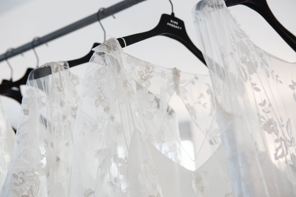 La créatrice parisienne joue sur les contrastes avec de délicates broderies en haut et du crêpe lourd en bas des robes de mariée.