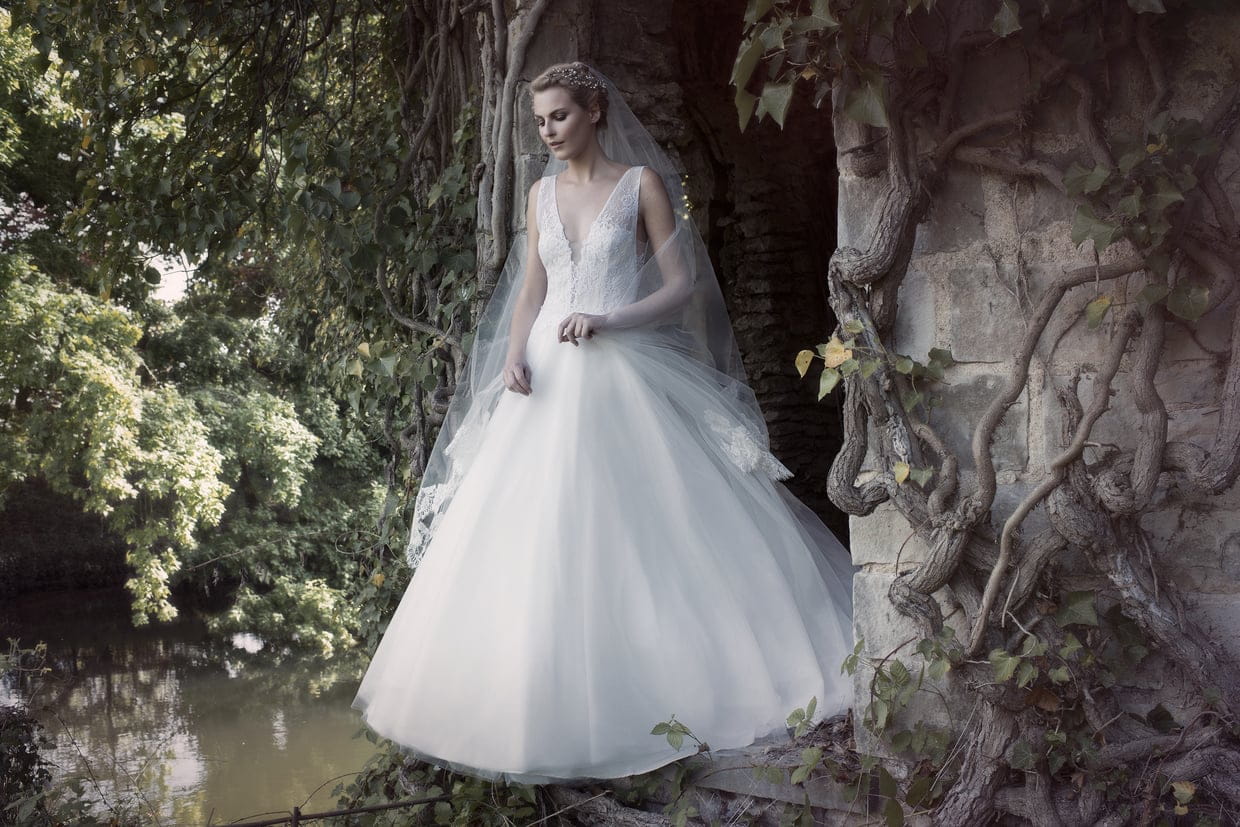 Romantique et féerique, le modèle Corentine de la collection 2018 de Cymbeline réinterprète les coupes et les matières de la robe de mariée traditionnelle. Avec son décolleté plongeant et les superpositions de voile, la robe Corentine a tout pour séduire les futures mariées romantiques !