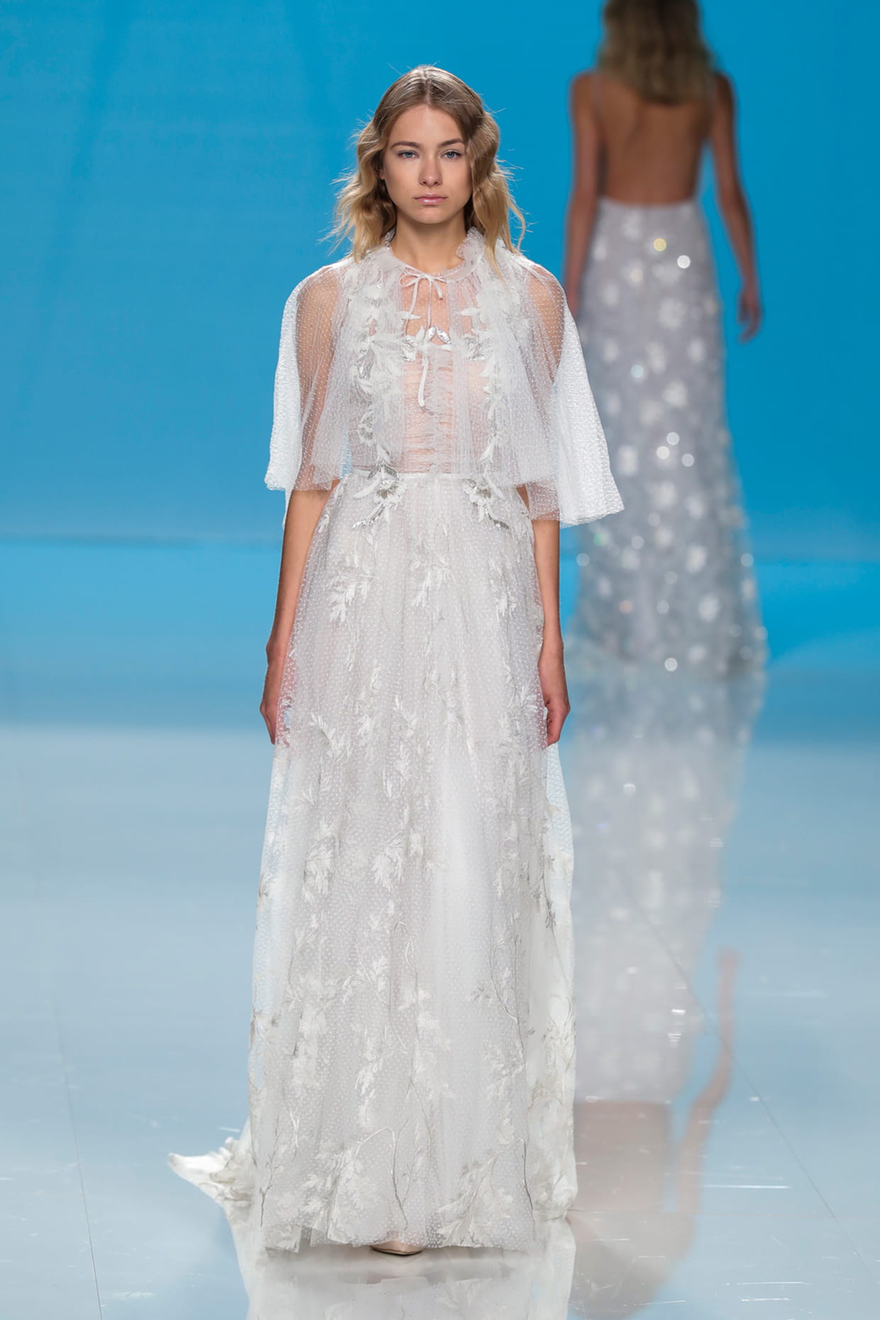 On aime particulièrement ce modèle de robe de mariée, un brin folk, avec ses volants qui tombent sur des épaules dénudées et sa coupe hippie.