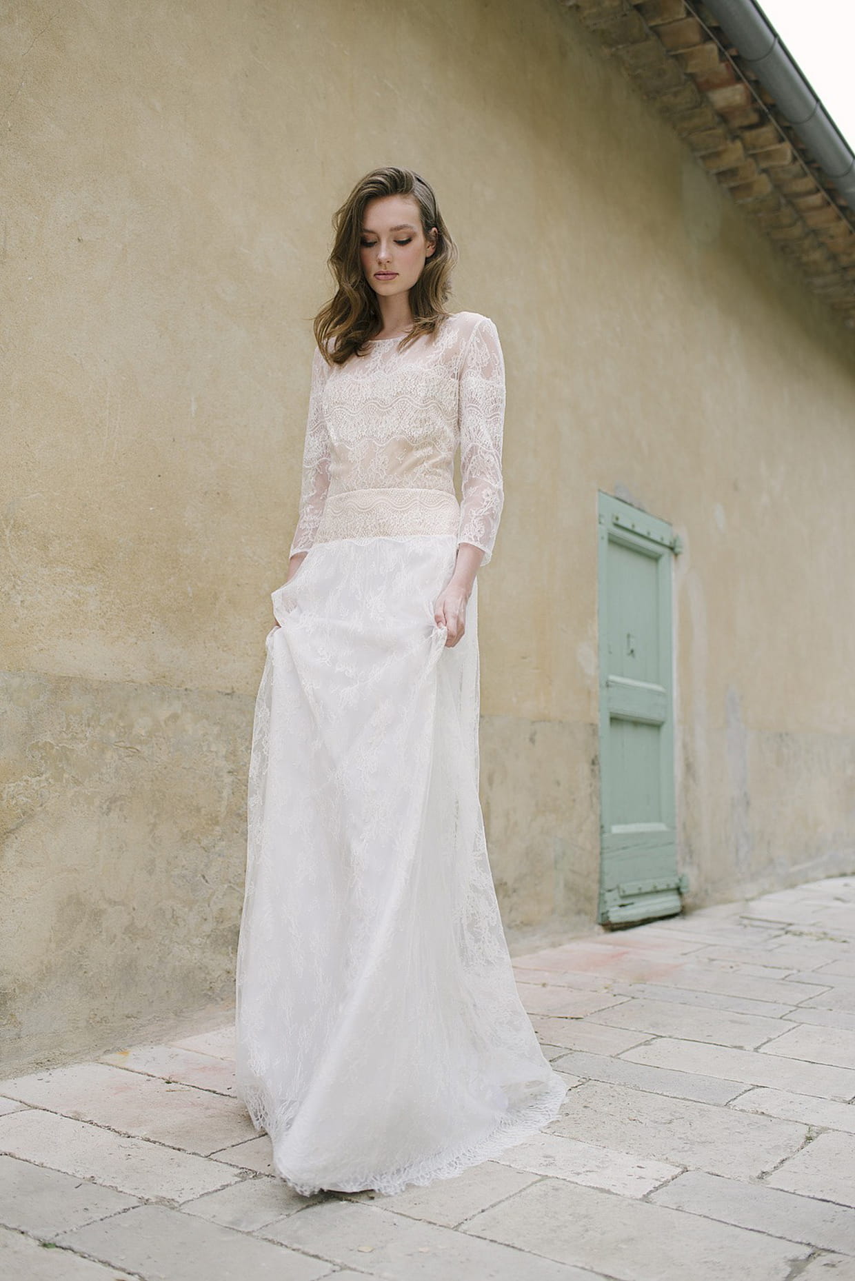 La robe de mariée Mahault sublime avec finesse la silhouette des futures mariées. Avec son haut à manches longues et en dentelle, ce modèle en séduira plus d'une !