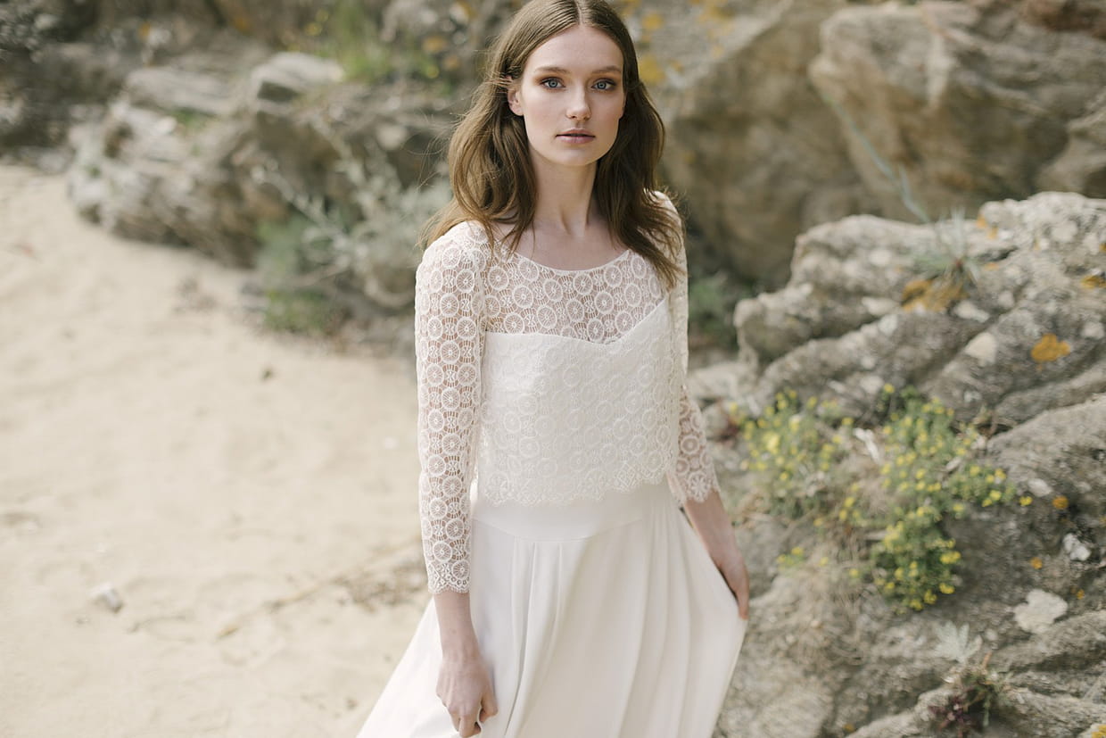 Le haut en guipure met en valeur la robe bustier de la mariée. A adopter sans hésiter le jour du mariage pour plus de style. On aime aussi la jupe fluide et la longue traîne.