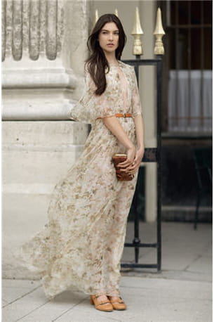 La maison Chloé imagine une parenthèse romantique pour sa collection croisière. Voile et imprimé fleuri confèrent à ce modèle un effet aérien. Une allure féminine et presque intemporelle pour jouer les vestales des temps modernes ou les jeunes filles en fleurs.