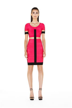 Chez Hervé Léger by Max Azria, on voit la vie en rose ! Cette robe se fait graphique en associant un rose très flashy et des lignes noires. Un esprit années 1980 renforcé par l'effet brassière du haut. Technicolor !