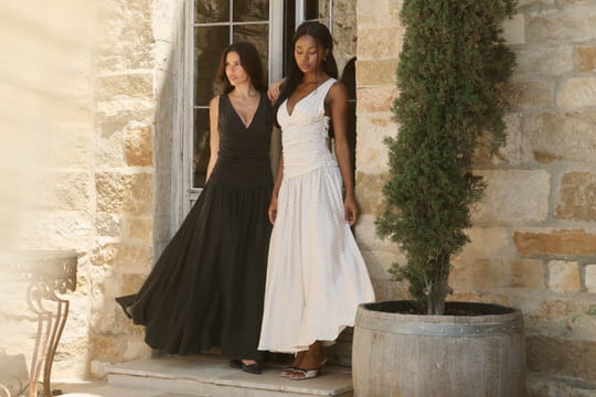 La palette, volontairement sobre, évoque la lumière et les matières d'un été méditerranéen : blanc éclatant, crème doux, bleu pastel, ivoire, pêche… Côté coupes, on retrouve de longues robes fluides à pois ou en satin imprimé, des mini-jupes en broderie, des corsets structurés, des tops asymétriques ou encore des robes façon nuisette. La robe à pois, en version maxi, s'impose comme pièce phare : un modèle qui mixe esprit rétro et coupe ajustée, à mi-chemin entre féminité romantique et allure affirmée.