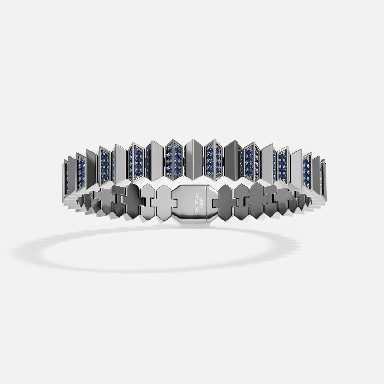 Ce bracelet articulé en argent 925, travaillé avec ou sans détails ruthénium, se décline en plusieurs largeurs. Les modèles fins se prêtent au jeu de l'accumulation, tandis que les versions plus larges apportent une structure marquée au poignet.