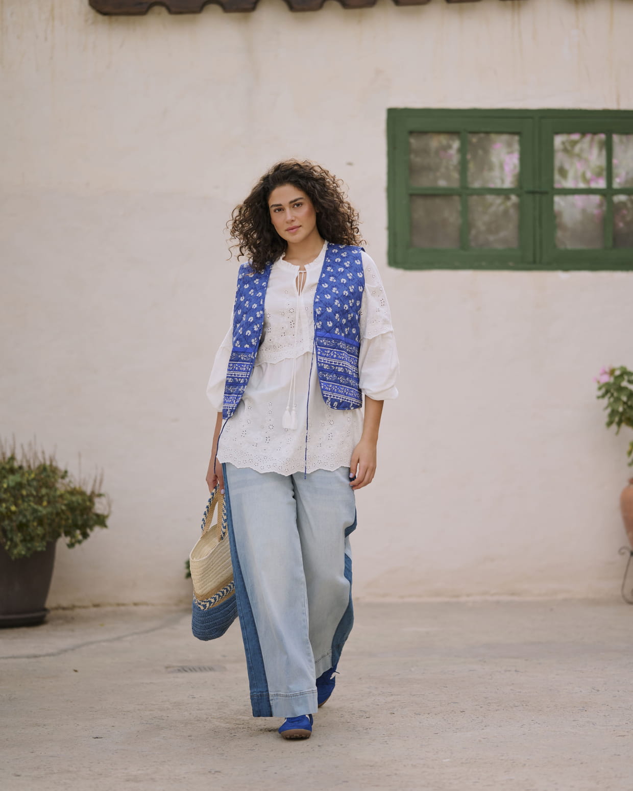Blouse broderie anglaise blanche, gilet imprimé bleu cobalt et jean large, look bohème structuré.