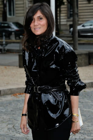 Emmanuelle Alt et son trench noir en skaï ceinturé © Marechal Aurore ABACA