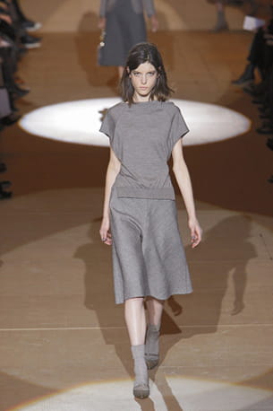 Jupes en laine longueur genou le jour, robes fluides sous des manteaux au large col le soir. Chaussettes dans des chaussures à brides pour chacune des silhouettes... Le créateur s'est inspiré de la garde-robe des années 1940 pour sa collection automne-hiver 2010-2011. Côté couleurs, le gris et le beige clair prédominent, ponctués ici d'un vert anis, là d'un noir intense. Sans complexe, Marc Jacobs assume un vestiaire simple et facile à porter qui ne cherche pas à briller par sa créativité, mais par sa qualité.