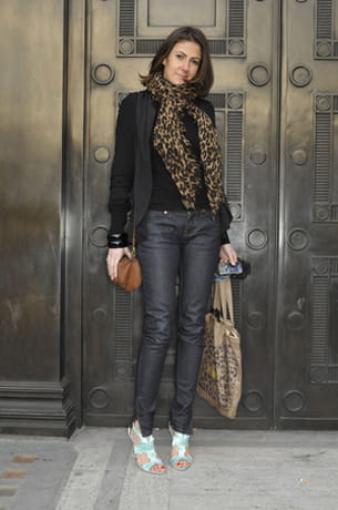 Veste noire et jean brut : de prime abord, ce looks semble assez classique... Et pourtant ! On note la couleur des talons hauts, un turquoise très vif, qui apporte toute son originalité à la silhouette.