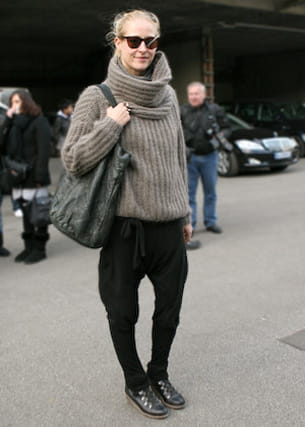 Son look : un gros pull en laine, un sarouel noir, des chaussures Flip Flop.