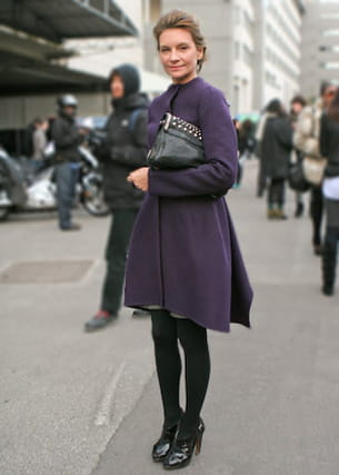 On aime : la forme du manteau, bouffante à l'arrière, cintrée et serrée aux épaules. Les chaussures vernies et le sac clouté apportent du clinquant à l'ensemble très raffiné.