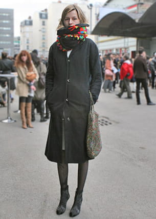 On aime : la silhouette longiligne est accentuée par le manteau très près du corps et les chaussures à bout pointu. Le sac en perles colorées casse l'autstérité de l'ensemble avec une jolie touche fantaisie.