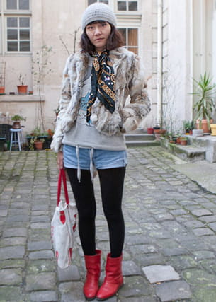 On aime : son côté "je vais aux défilés mais je ne me prends pas la tête", ses bottines rouges vif très fashion, son short en jean, à la fois confortable et sexy.
