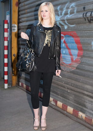 On aime : l'association de la chevelure platine avec le dessin doré est les chaussures beige clair qui adoucissent le reste de la tenue, beaucoup plus "dark".