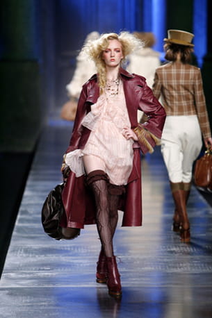 Manteau en cuir bordeaux sur robe en soie rose pâle imprimée © DR