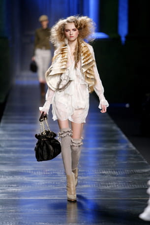 Gilet en renard et soie blanc cassé sur robe en soie blanc cassé brodée © DR