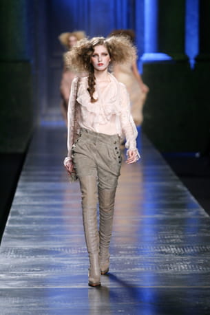 Chemise en soie rose pâle brodée sur pantalon en daim taupe © DR