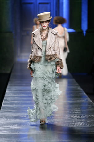 Veste en astrakan taupe sur robe en soie sauge © DR