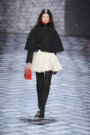 Chemisier à volants zippés sous cape Page / Jupe de drap de laine plissée écru