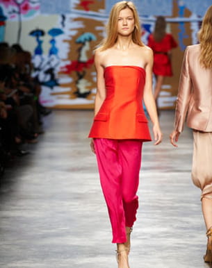 Marier le rose fuchsia et le rouge, il fallait oser. Mais la magie fonctionne et Stella McCartney nous offre un ensemble original et coloré. Le bustier un peu rigide associé à un pantalon plus fluide crée un décalage élégant pour un résultat qui se porte aussi bien en journée qu'en soirée pour se faire remarquer.