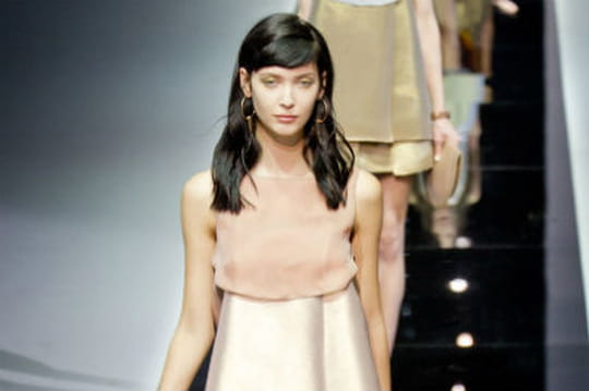 Giorgio Armani se livre à un exercice graphique avec des tops minimalistes, bicolores et destructurés ou un imprimé arty plus présent en fin de défilé. Le tartan et les rayures obliques sont aussi de la partie tout comme les paillettes de cuir qui viennent réinventer un short ou une jupe portefeuille. Car dans un esprit de légèreté, le foulard s'inscrit en fil rouge sur les modèles, s'imposant en volants ou s'évanouissant en un pan asymétrique. Quant aux décolletés bénitier et aux jeux de plissés, ils ont la part belle sur les modèles. Enfin, les superpositions s'amusent à en ajouter une couche tout en variant les matières et les coloris.