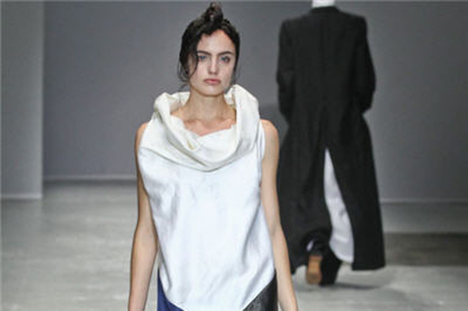 La créatrice reste dans la sobriété jusque dans les couleurs. Enormément de noir, quelques touches de blanc et une pointe de bleu et d'ocre de temps en temps. Certaines silhouettes à double face arborent même un dos tout en lin beige, qui contraste avec l'avant immaculé sur une robe à smockes par exemple. Pour le soir, le tissus s'allège et se drape plus naturellement. Comme sur ces combinaisons fluides, ces jupes longues transparentes, ou même ces robes ultra-échancrées dans le dos et sur le côté. Comme chez Fendi, Moon Young Hee a joué avec des effets d'optiques. Sauf qu'ici c'est carrément le tissus qui se projette en 3D. Comble de la sophistication : le final du défilé et ces tops aux cols de Pierrot qui entourent le visage de tout l'art et toute la technique de la créatrice.