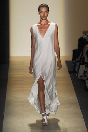 L'été 2011 sera féminin ou ne sera pas chez BCBG by Max Azria. Jeu sur les coupes et effets graphiques offrent des robes qui ne sont pas sans évoquer les modèles d'un certain Calvin Klein. Pas de pantalon, tout juste une combinaison bustier et vaporeuse. A la blancheur immaculée qui sied si bien à l'été s'opposent les couleurs acidulées d'une palette vitaminée. La fluidité des tissus souligne la légèreté essentielle d'une saison où il fait bon vivre. Si la longueur n'est pas de rigueur, elle trouve sa place parmi les robes courtes de la collection qui s'achèvent en un léger voile de tulle. Les modèles s'habillent parfois de petits détails comme une impression pois tout en subtilité et transparence ou encore un jeu de belles dentelles qui consacre l'élégance. Un exercice de style sans fausse note !