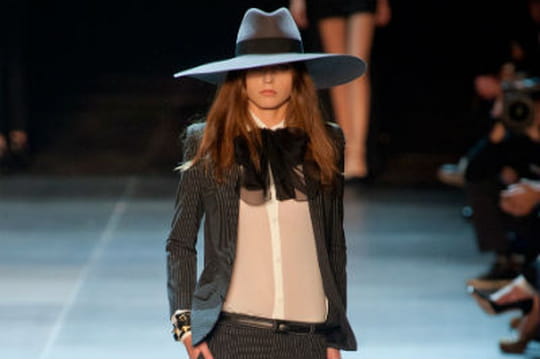 Coiffés de grands chapeaux, les mannequins affichent une silhouette qui mixe sans surprise les codes masculins et féminins avec une forte présence du pantalon slim, pièce phare du vestiaire Slimane pour réinventer le smoking féminin, classique du dressing Saint Laurent. Le gilet sans manche s'invite en troisième pièce tandis que la lavallière prend de l'ampleur en flirtant avec le foulard. La féminité trouve davantage sa place dans des détails au fort potentiel séduction : une blouse transparente, une veste dorée, un décolleté plongeant jusqu'au nombril ou encore des escarpins façons Salomé ou à brides. La robe s'invite dans un esprit très gipsy chic, ample, à longues manches et même parfois imprimée. Une ceinture en cuir venant relever sa taille et la structurer. Parfois, elle s'autorise une asymétrie, dévoilant les jambes et offrant une traîne pour un résultat très glamour.