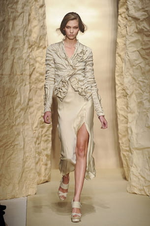 Pour le printemps-été 2011, Donna Karan reste fidèle à son style épuré. La créatrice nous propose pour notre plus grand bonheur un vestiaire estival tout en sensualité dans des déclinaisons de beige ou de caramel d'une extrême élégance. Les robes restent longues aux drapés exquis et au froissé des plus chics. Tantôt nouées, tantôt croisées et élégamment décolletées, elles s'habillent parfois de fleurs romantiques. Voilà une garde-robe parfaitement glam' pour les belles de l'été 2011.