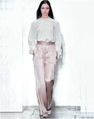 Chez Vanessa Bruno, les couleurs d'hiver sont douces, à l'image de cet ensemble pastel. La blouse à plastron plissé en crêpe de Chine ivoire se porte rentrée dnas un pantalon large taille haute en satin de viscose de couleur chair.