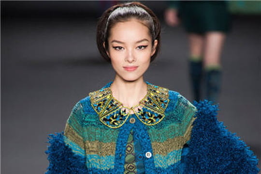 Anna Sui, la créatrice née à Détroit, a plongé l'audience dans l'époque de Sylvie Vartan, Johnny Hallyday et Françoise Hardy ! C'est d'ailleurs le tube "Poupée de cire, poupée de son" de France Gall qui a ouvert les festivités avec une chorégraphie et des modèles très 60's. Cette mise en scène unique et enchanteresse a transformé le défilé en spectacle total. Robes chasubles bordeaux, bleu marine ou noires, jupes légères et bariolées... Pour sa collection automne-hiver 2013-2014, le court est à l'honneur ! Ne vous inquiétez pas, les gambettes sont protégées du froid grâce à des collants colorés ou brillants qui accompagnent les tenues de nuances flashy. Les robes sont ornées de col Claudine, accessoire très tendance depuis plusieurs saisons. Il est toujours magnifiés par des pierreries ou des cravates-bijoux, pour une touche masculine. Les ensembles sont aussi accessoirisés de pendentifs lourds en forme de croix, assez proches des premiers bijoux de Mademoiselle Chanel.