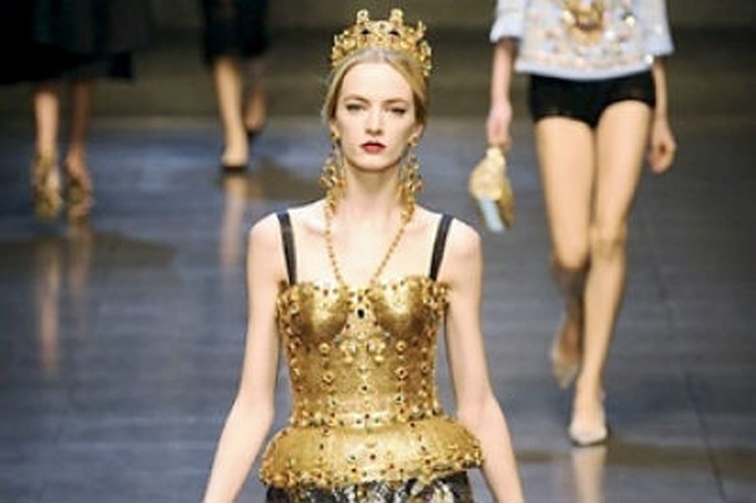 Chez Dolce & Gabbana, l'heure est au recueillement pour cette fashion week automne-hiver 2013-2014. Les images pieuses s'impriment sur les robes et les mannequins sont coiffés de couronne et parés de bijoux précieux. Le duo de créateurs fait référence à la religion par le biais de ses riches représentations dans les églises. Un travail d'orfèvre et d'adoration qui se retrouve sur les créations de la griffe italienne. Depuis quelques saisons, cette dernière semble s'être assagie pour recentrer sa création vers les codes historiques et emblématiques de la femme italienne. Cette saison, les madones illuminent le podium, telles des apparitions divines. Les robes icônes associent détails et coloris de fresques pour un rendu inspiré. Mais qui dit influences religieuses, ne dit pas forcément censure des codes glamour, bien au contraire. Les robes osent remonter jusqu'au milieu de la cuisse et les bras se dénudent. la dentelle noire joue de la transparence en contraste avec le doré omniprésent sur toute la première partie de la collection. Lentement, cette dernière évolue vers un esprit moins Renaissance mais qui reste rétro.