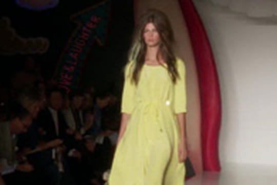 Chez Mulberry, l'heure est festive. Dans un décor de fête foraine avec camion de glaces, limonade rose et ambiance sucrée, la maison présente les créations de sa nouvelle créatrice Emma Hill. Parmi les invités de marque, on note surtout la présence de l'icône par exellence Kate Moss et la jeune génération représentée par l'actrice de Twilight, Kristen Stewart. La caution people et fashion est assurée. Place à un défilé où se succèdent robes et jupes longues, portées avec des parkas ou des perfectos courts. Les couleurs sont douces, dominées par du vert amande, du jaune paille et du rose nude. Le noir n'est pas absent. Côté accessoires, tout le monde a les yeux rivés sur les sacs. Les classiques de la maison de maroquinerie anglaise comme le modèle Alexa n'échappe pas à la vague de couleurs acidulées. Les mannequins aux cheveux façon sixties dévoilent des combinaisons de couleurs audacieuses et alternent petites robes, tailleurs shorts et cirés jaunes. C'est régressif, ça pétille et ça brille comme une promesse d' un été doux et léger comme une barbe à papa.