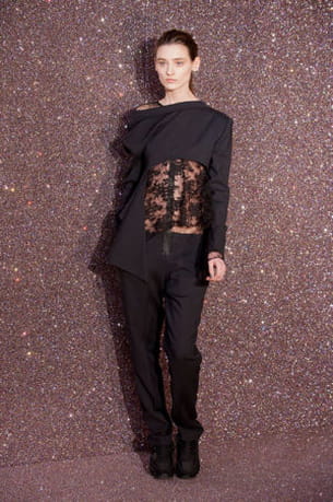 Anne Valérie Hash utilise la dentelle pour féminiser des tenues a priori masculines. Dans cette combinaison, elle dévoile la peau comme un bijou travaillé, inclu au tissu noir. Une allure unique et un compromis réussi !