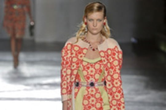 En route pour les Fifties avec le défilé Prada prêt-à-porter printemps-été 2012. Les imprimés à fleurs stylisées et les couleurs pastel instaurent une sensualité très rétro. Soutien-gorge bandeaux, jupes droites frappées d'une Cadillac et maillots de pin-up sont les pièces phares de cette nouvelle collection de la marque italienne. Les modèles jouent sur les contrastes, le cuir s'opposant à des tissus vaporeux quand le marron se démarque du bleu ciel ou du rose poudré. La douceur des motifs nous promet un été tout en légèreté. Le manteau se porte droit et large, parfois ceinturé mais ouvre aussi la voie à la petite veste portée ouverte. Les robes jouent sur un effet graphique. Des flammes stylisées viennent réveiller des robes pas si sages. Le sac se porte à la main façon madame et bien sûr le talon s'impose. La femme au foyer de cette époque dorée révèle toute sa féminité et devient l'objet de toutes les convoitises. Un esprit résolument rétro pour un vestiaire façon Mad Men ou Marilyn !