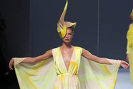 Chez Issey Miyake, les collections riment toujours avec voyage onirique. M. Miyamae ne déroge pas à la règle avec des modèles poétiques qui sacrent le printemps. Coiffés de bibis façon boutons de fleurs, les mannequins s'avancent dans une chorégraphie originale qui rompt avec les codes classiques des défilés. Si certains modèles, tels que les leggings troués, peuvent surprendre pour leur vision très futuriste, c'est davantage la beauté des robes qui éclosent sous nos yeux qui retiendra notre attention. Dans une palette de tons pastel où domine un jaune lumineux, les modèles explorent toutes les coupes entre asymétrie contrôlée et découpes audacieuses. Du sarouel à la combinaison en passant par la robe dos-nu et le bustier, toutes les formes sont envisagées. Les collants aux imprimés graphiques viennent compléter cette vision moderniste d'un jardin printanier dans lequel on se plaît à rêvasser.