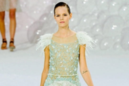 Chez Chanel, dans un décor de bulles aériennes d'où émerge la chanteuse Florence Welch dans une référence très "Botticellienne", la nouvelle collection revisite les codes de la maison tout en légèreté. Karl Lagerfeld n'échappe pas à la vague de douceur pastel qui envahit les défilés prêt-à-porter printemps-été 2012. Beige poudré, vert d'eau, rose dragée... La palette de couleurs s'impose aux côtés des classiques noir et blanc. Un duo graphique que l'on retrouve évidemment d'abord discrètement en trait de fusain dessiné sur un tissu immaculé. Les imprimés, quant à eux, s'invitent en pétales colorées sur des robes qui prennent des accents arty. Les plumes d'oiseaux de paradis, au doux parfum d'années folles, répondent aux pastilles façon écailles pour une métaphore filée du monde aquatique. Dans les profondeurs du monde de la maison de la rue Cambon, la petite veste revisite l'esprit officier et les sirènes, parées de perles, nous envoûtent dans des tenues nacrées. Une vague de bleu annonce les incontournables maillots de bains pour des nymphes sophistiquées. Le soir, les robes prennent du volume tout en conservant un chic intemporel. Le maître Karl nous plonge une fois de plus dans un océan de douceur et de raffinement.