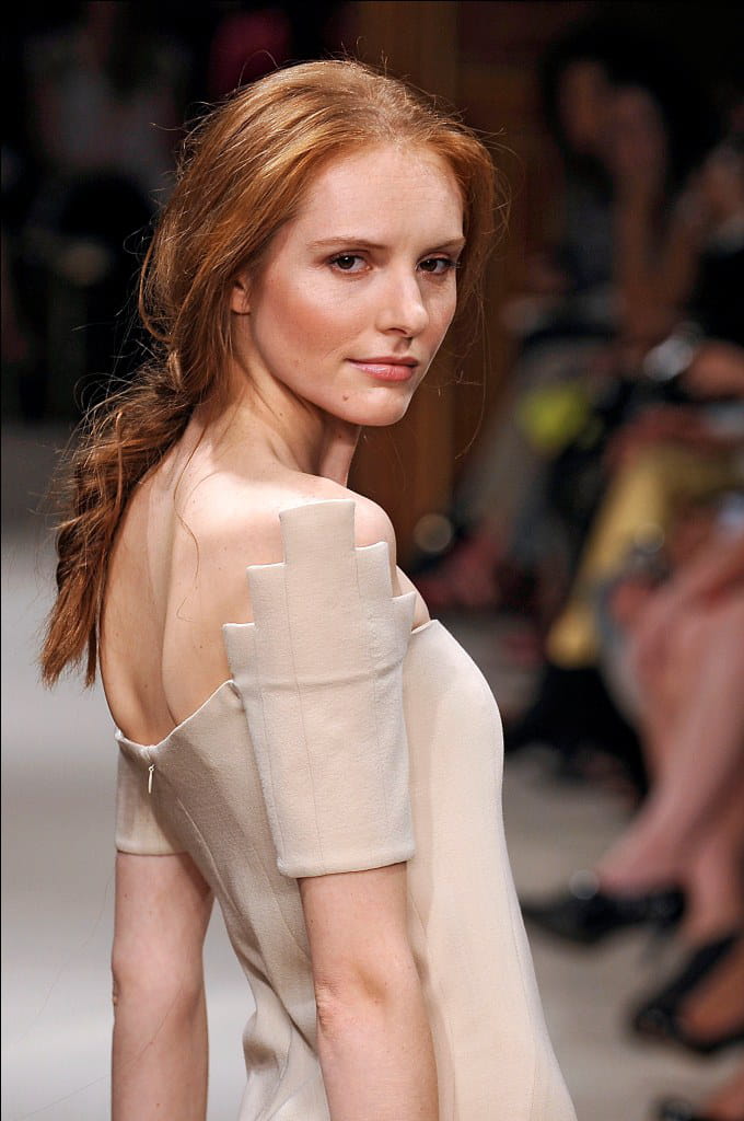 Pour sa collection printemps-été 2012, la jeune créatrice s'est inspirée de l'église géométrique de Hallgrimur en Islande et des champs de blé. Les lignes sont tour à tour graphiques et fluides. Les étoffes sont raffinées et les teintes poudrées. De l'or, des épis de blé, de la soie pastel, du tweed léger, de la broderie fine : tous les ingrédients sont réunis pour une garde-robe chic et féminine. On aime les robes drapées, les variations plissées, les jeux de transparence et les combi-pantalons fluides. Le tout sublimé par de fines coiffures tressées. Soulignons aussi le choix du chausseur François Najar qui rehausse les silhouettes avec deux modèles inédits d'escarpins Louis XV en Wendy Or, un cuir chevreau métallisé avec impression tissée. Une association luxueuse pour une collection élégante et ensoleillée. A tout juste 26 ans, Claudine Ivari est prête à entrer dans la cour des grands.