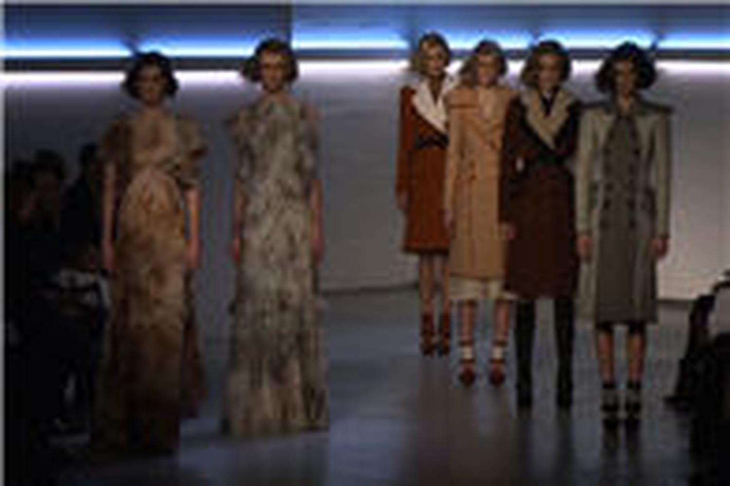 AFP - Les sœurs californiennes Kate et Laura Mulleavy font preuve d'un esprit moins décalé que ce à quoi elles nous avaient habitués. Des robes sages, un brin rétro, de la grosse maille et des blousons d'aviateur en peau lainée composent un vestiaire assez classique. Les coups d'éclat viennent des références à l'art aborigène : des imprimés pointillistes sur des robes à la fraîcheur juvénile, des motifs graphiques sur des manteaux croisés, des empreintes rupestres de mains sur des fourreaux du soir et surtout des escarpins aux talons en plexiglas remplis de sable.
